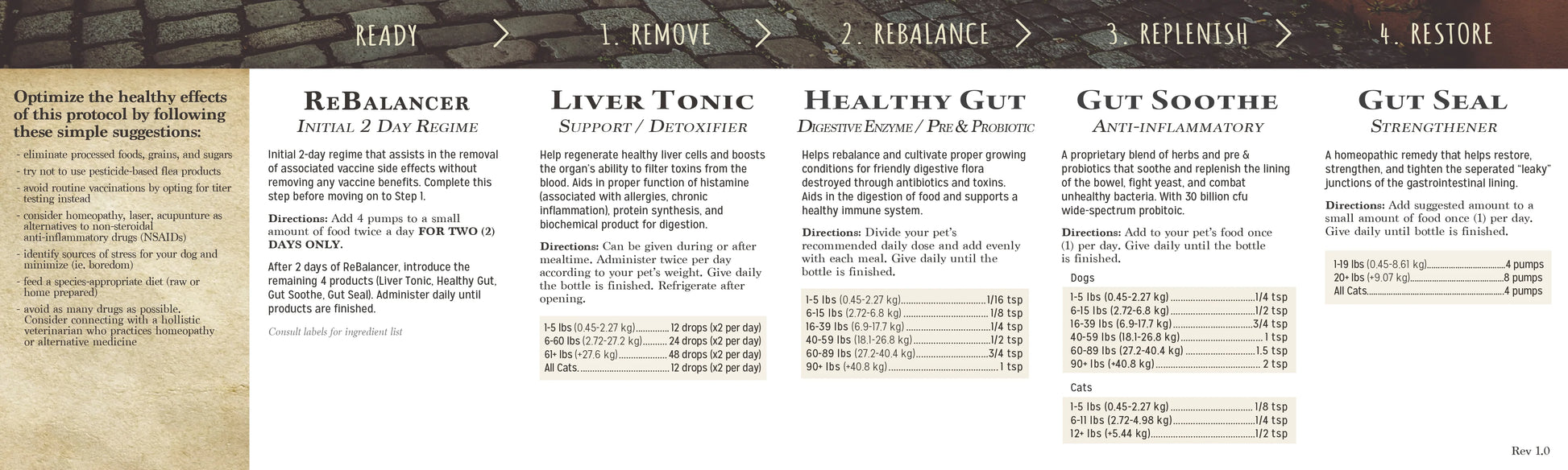 After completing the 2-day pre-step (Rebalancer), begin steps 1-2-3-4 at the same time. The products in steps 1-2-3-4 (Liver Tonic, Healthy Gut, Gut Soothe & Gut Seal) can be given together at the same time, as directed.